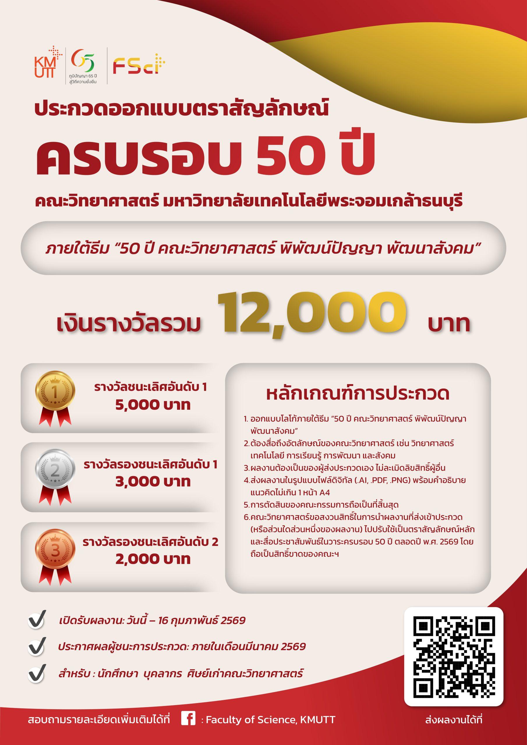 ภายใต้ธีม “50 ปี คณะวิทยาศาสตร์ พัฒนาปัญญา พัฒนาสังคม” เงินรางวัลรวม 12,000 บาท รางวัลชนะเลิศ 5,000 บาท รองชนะเลิศอันดับ 1 จำนวน 3,000 บาท รองชนะเลิศอันดับ 2 จำนวน 2,000 บาท คุณสมบัติผู้ส่งผลงาน นักศึกษา บุคลากร และศิษย์เก่าคณะวิทยาศาสตร์ มจธ. เปิดรับผลงาน ตั้งแต่วันนี้ – 16 กุมภาพันธ์ 2569 ประกาศผลผู้ชนะ ภายในเดือน มีนาคม 2569 ผู้สนใจสามารถศึกษาหลักเกณฑ์และส่งผลงานได้ที่ https://forms.gle/6guSbmyF8TyGPfBu7 หรือแสกน QR Code ในโปสเตอร์ สอบถามรายละเอียดเพิ่มเติมได้ที่ Facebook : Faculty of Science, KMUTT มาร่วมสร้างสัญลักษณ์แห่งความภาคภูมิใจในวาระ 50 ปี [...]