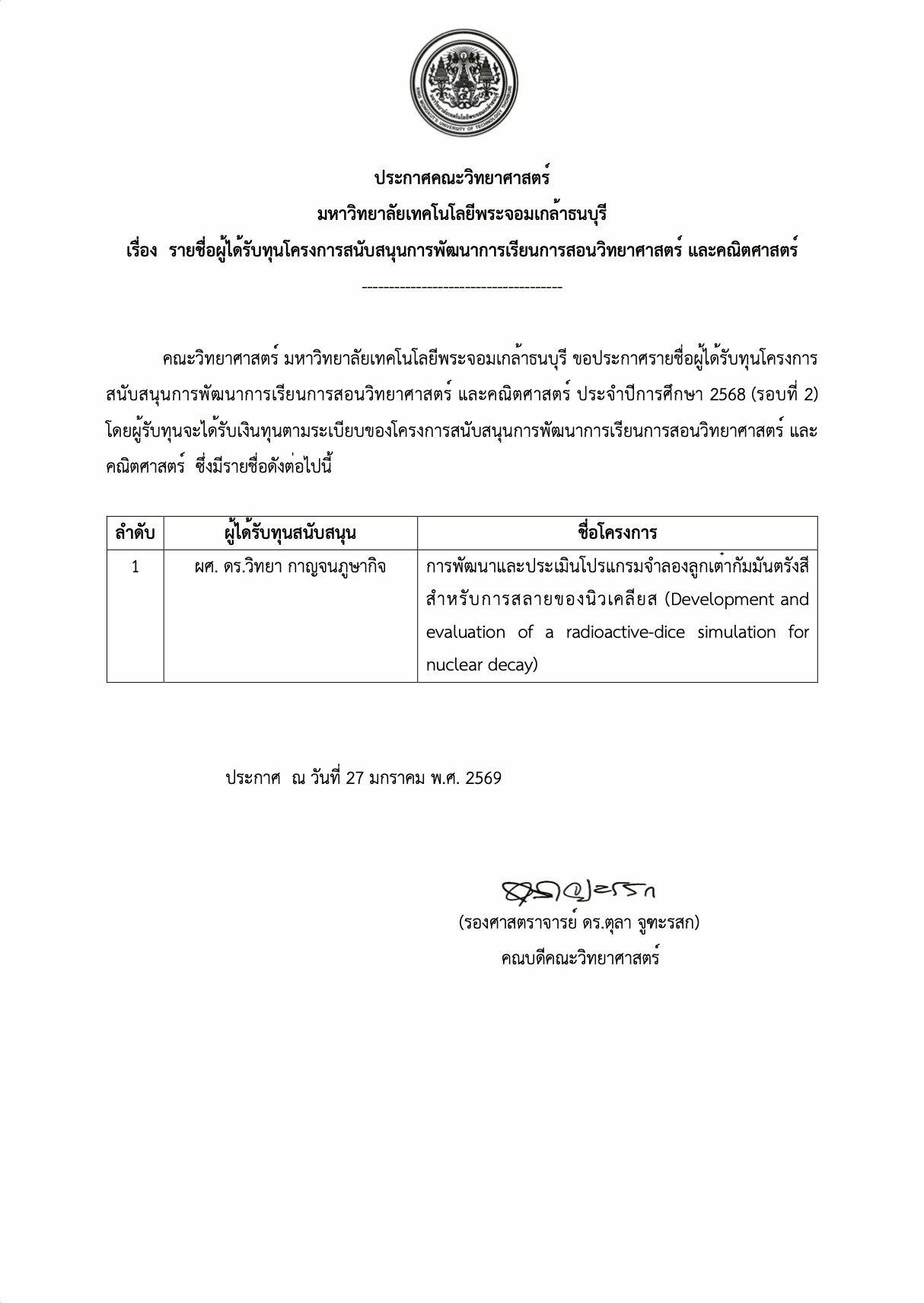เมื่อวันที่ 24 มกราคม 2569 คณะวิทยาศาสตร์ มหาวิทยาลัยเทคโนโลยีพระจอมเกล้าธนบุรี จัดกิจกรรม KMUTT FSci Open House 2026 ณ Learning Space คณะวิทยาศาสตร์ มจธ. โดยมีวัตถุประสงค์เพื่อประชาสัมพันธ์หลักสูตรการเรียนการสอน และช่องทางการรับนักศึกษา ทั้งในระดับปริญญาตรีและระดับบัณฑิตศึกษา รวมถึงโครงการเรียนล่วงหน้า (Pre-degree) และหลักสูตร Non-Degree ของคณะวิทยาศาสตร์ มจธ. ให้เป็นที่รู้จักอย่างแพร่หลายมากยิ่งขึ้น ในโอกาสนี้ได้รับเกียรติจาก รองศาสตราจารย์ ดร.ตุลา จูฑะรสก คณบดีคณะวิทยาศาสตร์ เป็นประธานกล่าวต้อนรับนักเรียน ผู้ปกครอง และผู้เข้าร่วมงาน พร้อมกล่าวเปิดกิจกรรมอย่างเป็นทางการ ภายในงานมีกิจกรรมที่น่าสนใจมากมาย อาทิ บูธแนะนำหลักสูตรจากภาควิชาต่าง ๆ, กิจกรรม OBEM “เรียนรู้ล่วงหน้าแบบ Pre-degree”, กิจกรรม “บินลัดฟ้า ไปกับ IA คณะวิทยาศาสตร์”, กิจกรรม Workshop จากทั้ง 4 [...]