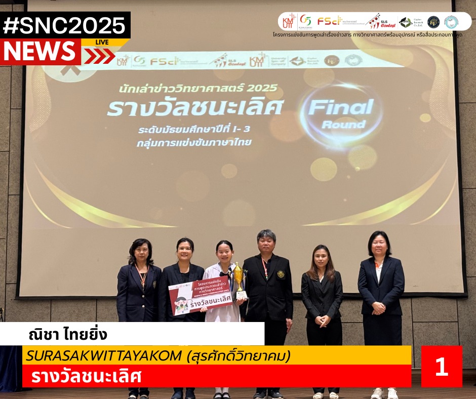 คณะวิทยาศาสตร์ มหาวิทยาลัยเทคโนโลยีพระจอมเกล้าธนบุรี (มจธ.) จัดการแข่งขันการพูดเล่าเรื่องข่าวสารทางวิทยาศาสตร์พร้อมอุปกรณ์หรือสื่อประกอบการพูด ภายใต้โครงการแข่งขัน Science News Communicator 2025 (SNC2025) ระหว่างวันที่ 13–14 ธันวาคม 2025 ณ มหาวิทยาลัยเทคโนโลยีพระจอมเกล้าธนบุรี โดยมีเยาวชนและนักเรียนจากหลากหลายระดับการศึกษาเข้าร่วมการแข่งขันอย่างคึกคัก