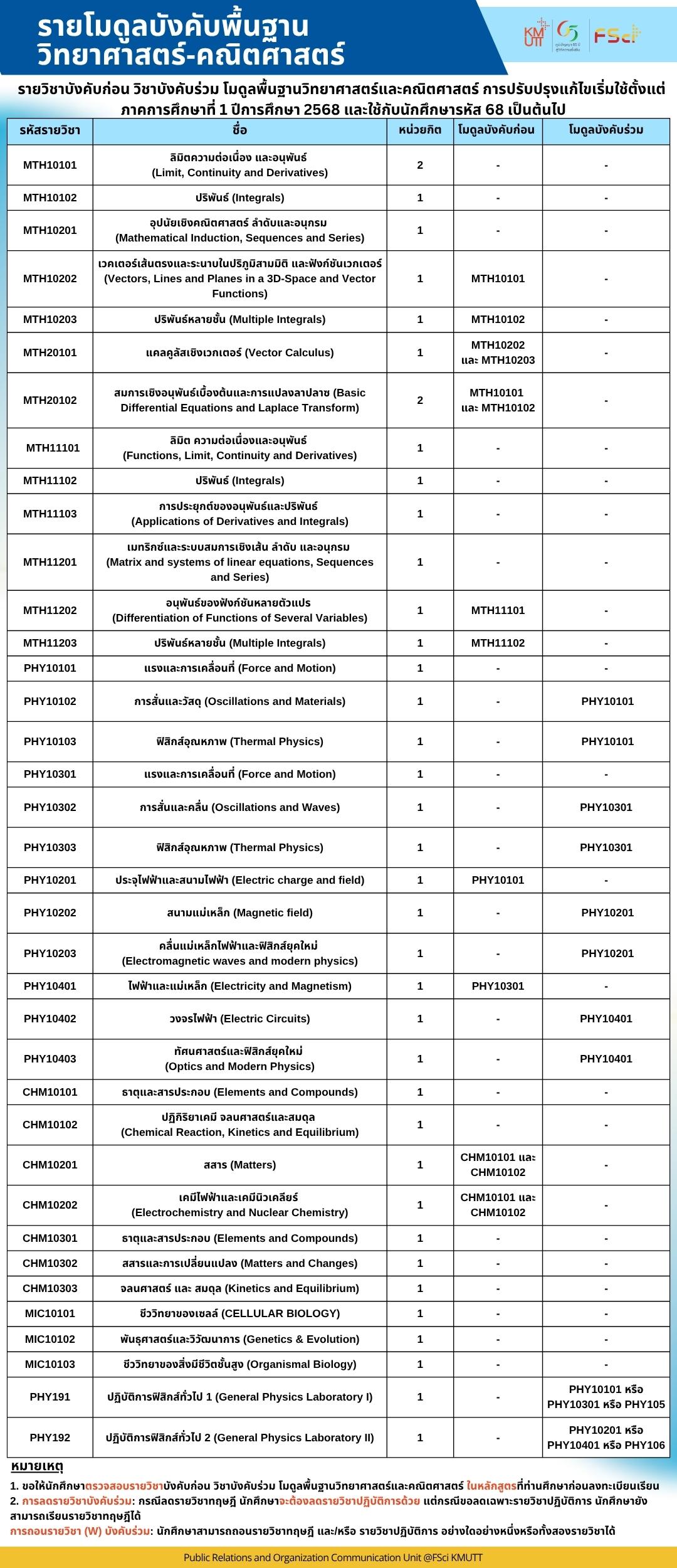 View Larger Image แนวทางการเปิดรายวิชาโมดูลพื้นฐานวิทยาศาสตร์ คณิตศาสตร์ ปีการศึกษา 2568 และ รายวิชาบังคับก่อน วิชาบังคับร่วม โมดูลพื้นฐานวิทยาศาสตร์และคณิตศาสตร์ การปรับปรุงแก้ไขเริ่มใช้ตั้งแต่ภาคการศึกษาที่ 1 ปีการศึกษา 2568 และใช้กับนักศึกษารหัส 68 เป็นต้นไป admin2025-10-20T10:46:34+07:00