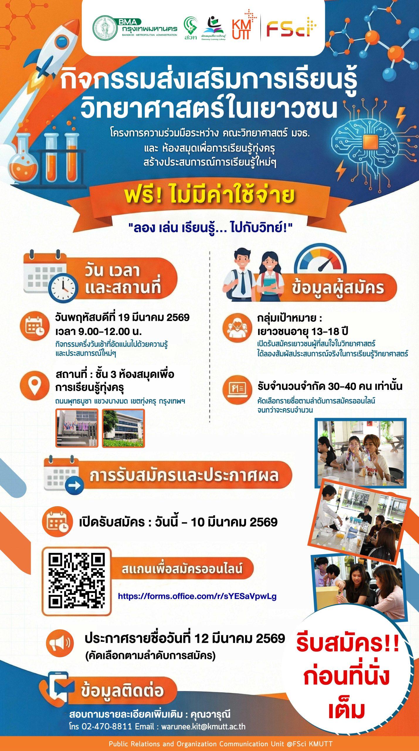 • คณะวิทยาศาสตร์ มหาวิทยาลัยเทคโนโลยีพระจอมเกล้าธนบุรี ร่วมกับ ห้องสมุดเพื่อการเรียนรู้ทุ่งครุ • เปิดรับสมัครเยาวชน อายุระหว่าง 13-18 ปี [...]