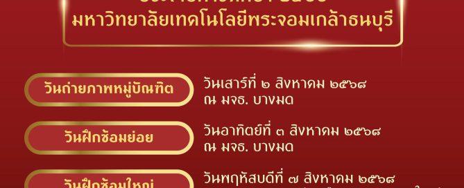 พระบาทสมเด็จพระเจ้าอยู่หัว ทรงพระกรุณาโปรดเกล้าฯ ให้ สมเด็จพระกนิษฐาธิราชเจ้า กรมสมเด็จพระเทพรัตนราชสุดาฯ สยามบรมราชกุมารี เสด็จพระราชดำเนินแทนพระองค์ ในพิธีพระราชทานปริญญาบัตรแก่ผู้สำเร็จการศึกษาจาก มหาวิทยาลัยเทคโนโลยีพระจอมเกล้าธนบุรี ประจำปีการศึกษา [...]