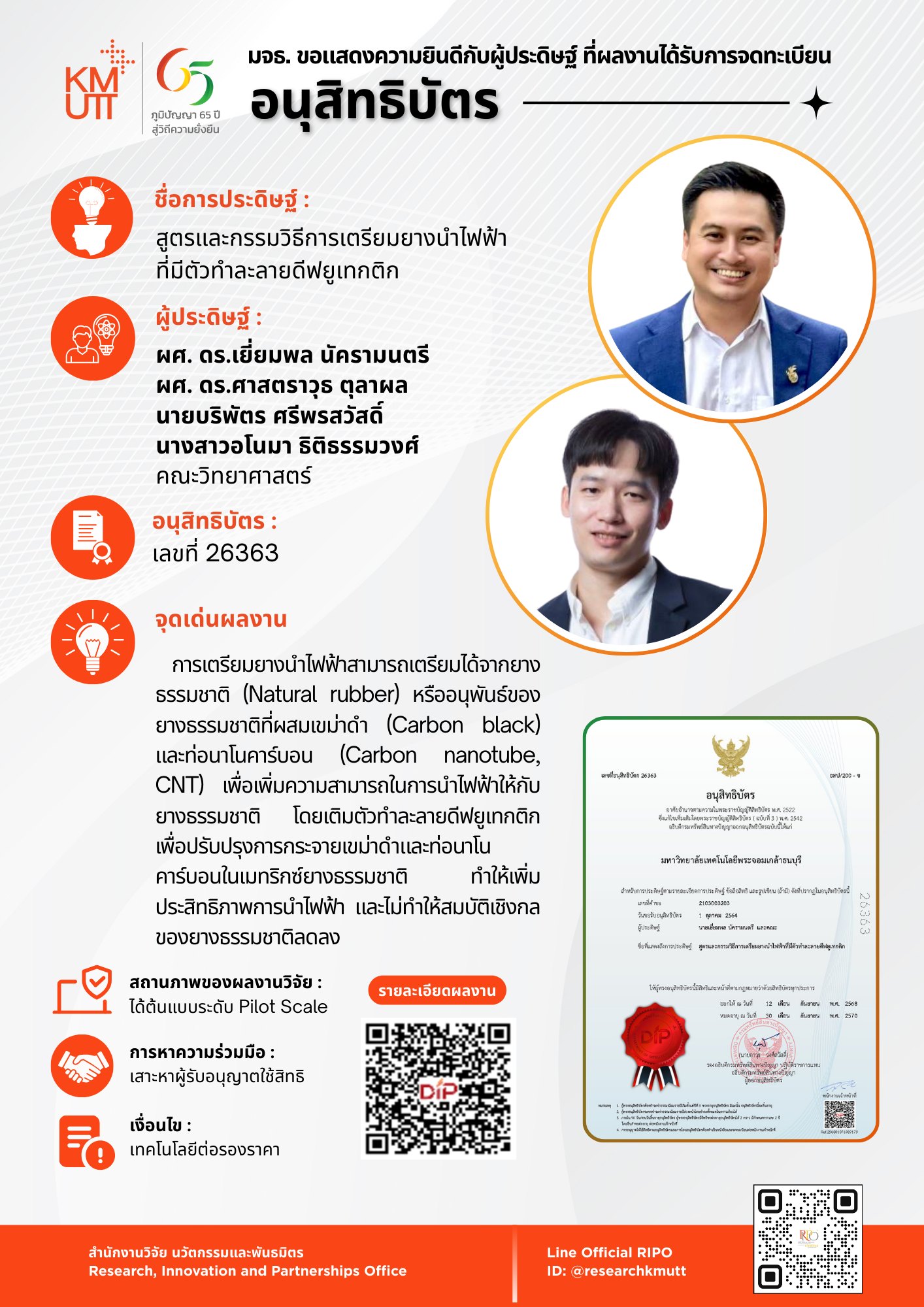 มจธ. ขอแสดงความยินดีกับผู้ประดิษฐ์ ที่ผลงานได้รับการจดทะเบียนอนุสิทธิบัตรชื่อการประดิษฐ์ : สูตรและกรรมวิธีการเตรียมยางนำไฟฟ้าที่มีตัวทำละลายดีฟยูเทกติกผู้ประดิษฐ์ :ผศ. ดร.เยี่ยมพล นัครามนตรีผศ. ดร.ศาสตราวุธ ตุลาผลนายบริพัตร [...]