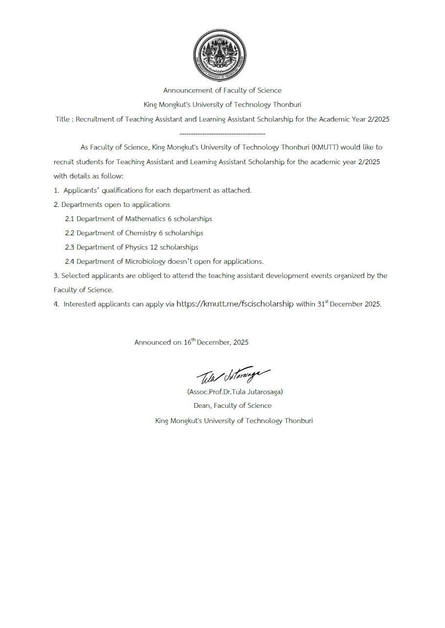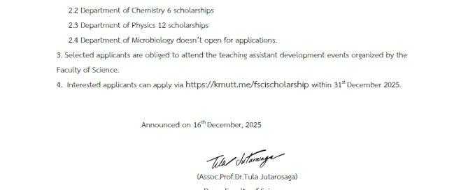 ตั้งแต่บัดนี้ – 31 ธันวาคม 2568 สมัครทาง https://kmutt.me/fscischolarship Faculty of Science [...]
