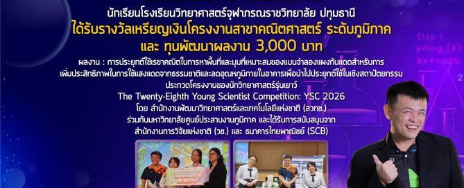 นางสาวธีร์จุฑา สุขแสง โรงเรียนเตรียมอุดมศึกษา ได้รับรางวัลเหรียญทองโครงงานสาขาคณิตศาสตร์ ระดับภูมิภาค และ ทุนพัฒนาผลงาน 3,000บาท ผลงาน : [...]