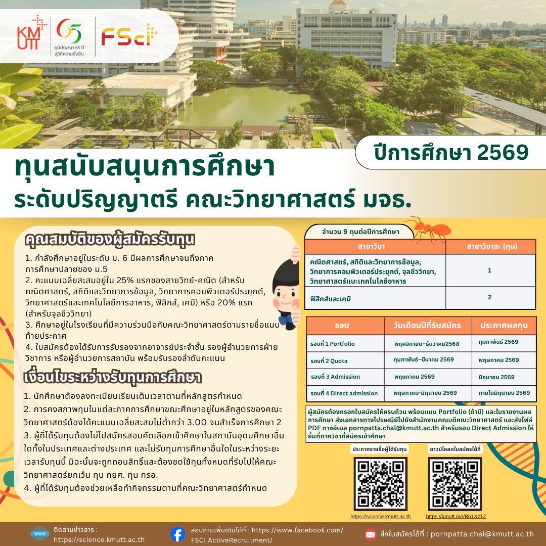 คณะวิทยาศาสตร์ มจธ. เปิดรับสมัคร ทุนสนับสนุนการศึกษา ปีการศึกษา 2569