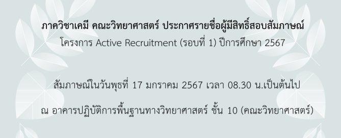 ภาควิชาเคมี คณะวิทยาศาสตร์ ประกาศรายชื่อผู้มีสิทธิ์สอบสัมภาษณ์ โครงการ Active Recruitment (รอบที่ 1) ปีการศึกษา 2567