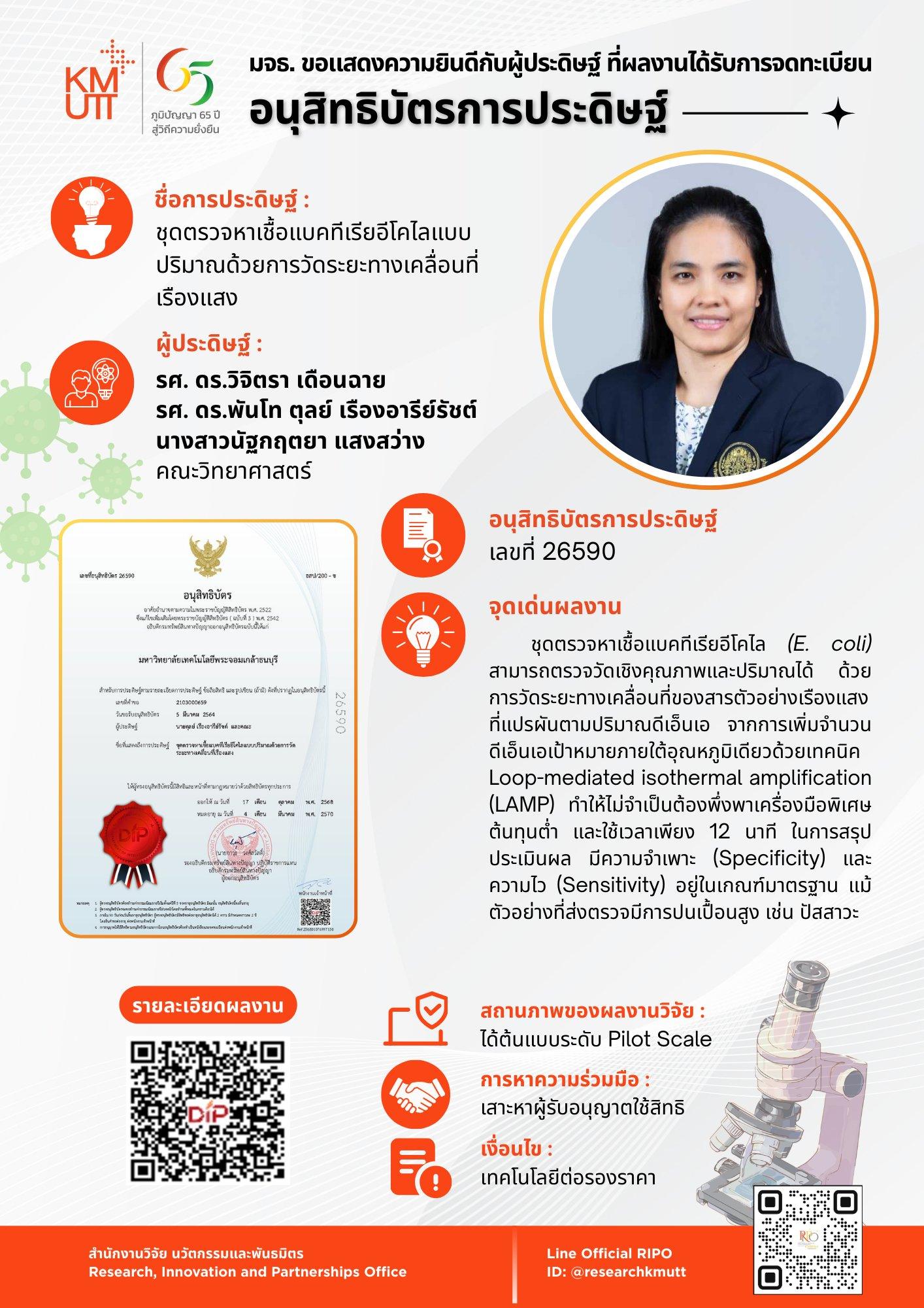 ชื่อการประดิษฐ์ : ชุดตรวจหาเชื้อแบคทีเรียอีโคไลแบบปริมาณด้วยการวัดระยะทางเคลื่อนที่เรืองแสง ผู้ประดิษฐ์ : รศ. ดร.วิจิตรา เดือนฉาย รศ. ดร.พันโท [...]