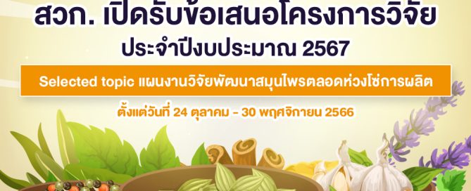 สวก. ประกาศรับข้อเสนอโครงการวิจัย Selected topic ภายใต้แผนงานวิจัยพัฒนาสมุนไพรตลอดห่วงโซ่การผลิต ประจำปีงบประมาณ 2567