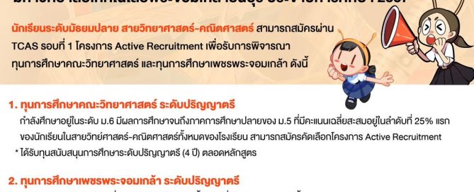 น้องๆสามารถเข้าไปอ่านรายละเอียดทุนการศึกษาได้จากคิวอาร์โค้ดด้านล่าง โดยน้องๆสามารถยื่นเข้ามา TCAS รอบ1 ในโครงการ Active Recruitment ได้แล้ว~ ทางคณะมีทุนมากมายให้น้องๆได้เลือก รอช้าไม่ได้แล้วว [...]